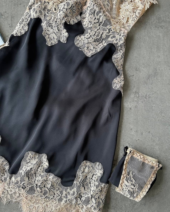 Sexy Deep V-neck Ice Silk Lace Patchwork Backless Camisole Nightgown