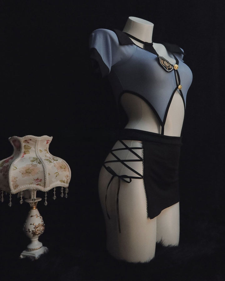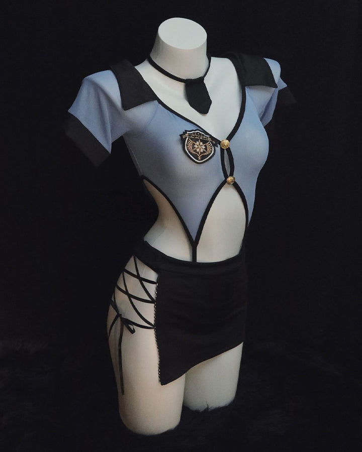 Answer the call of seduction with this daring Policewoman Uniform Cosplay Pajama Set. Designed for confidence and allure, this costume features a provocative blend of authority and playfulness. The signature lace-up front and strategic hollow-out mesh panels create a tantalizing "perspective" effect, while the classic police-inspired badge and cap add an authentic touch to your roleplay.