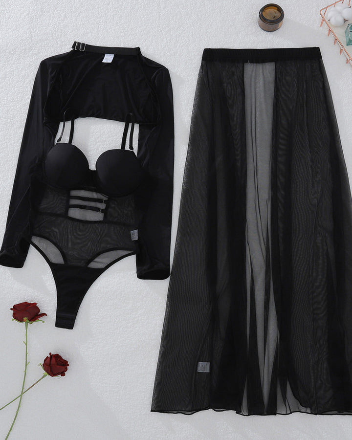 Sheer Mesh Bodysuit with Sexy Slit Skirt Three-piece Set