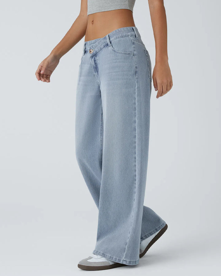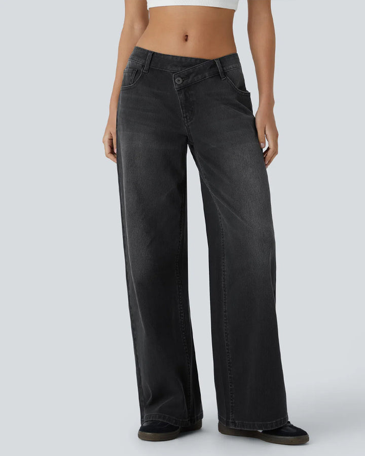 Jeans pour femmes asymétriques taille basse à jambes larges, poches zippées, coupe ample, denim délavé