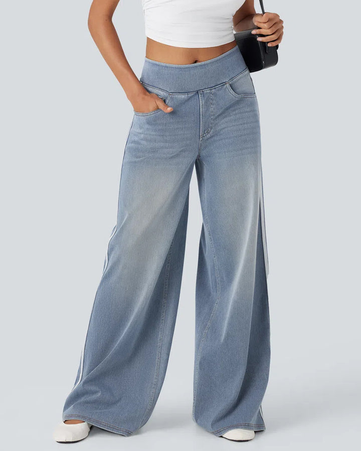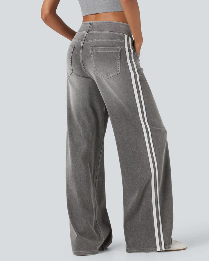 Jean décontracté à taille haute rayé, jambes larges, délavé avec poches
