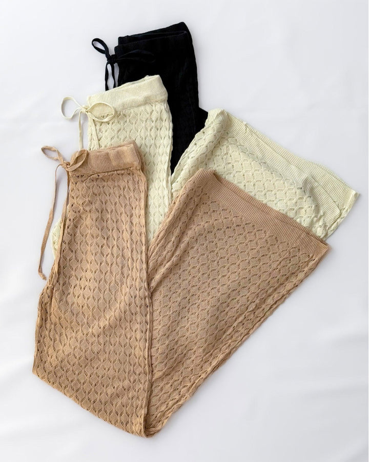 Ces pantalons de plage larges en tricot handhook creux présentent un design en tricot handhook respirant et magnifiquement réalisé avec une coupe ample et fluide. La silhouette à jambes larges et le motif en tricot creux créent une ambiance décontractée et bohème, parfaite pour les journées à la plage ou les sorties décontractées.
