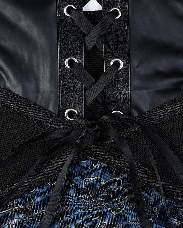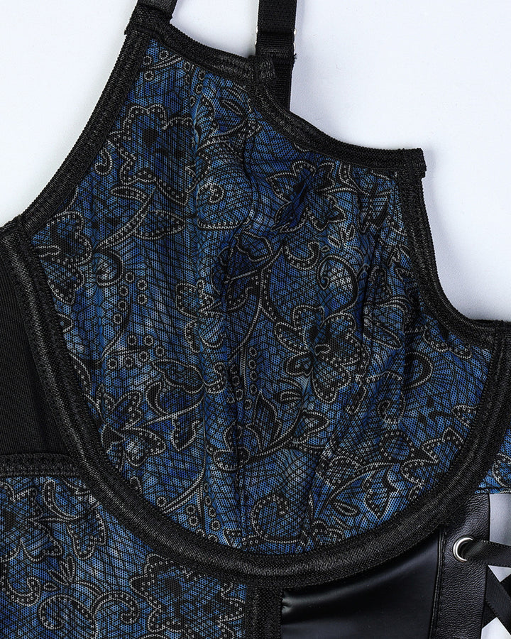 Body en maille imprimée rétro et cuir PU avec nœud et bretelles croisées