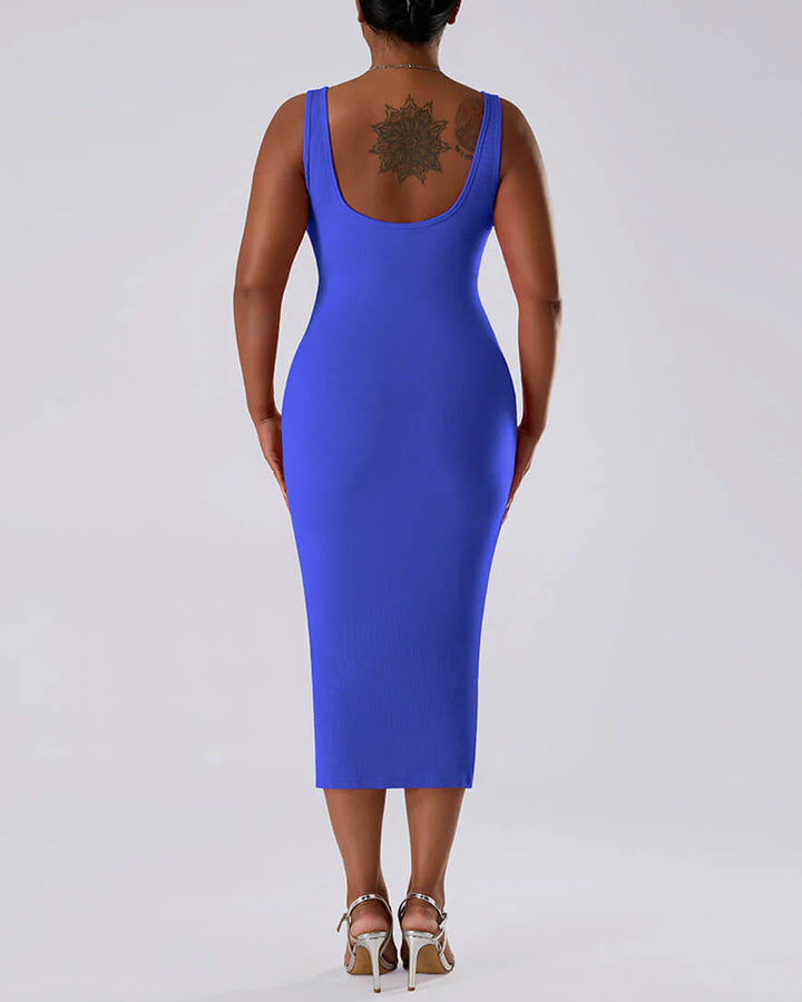 Robe longue sans manches de couleur unie avec taille et hanches rehaussées et gaine intégrée