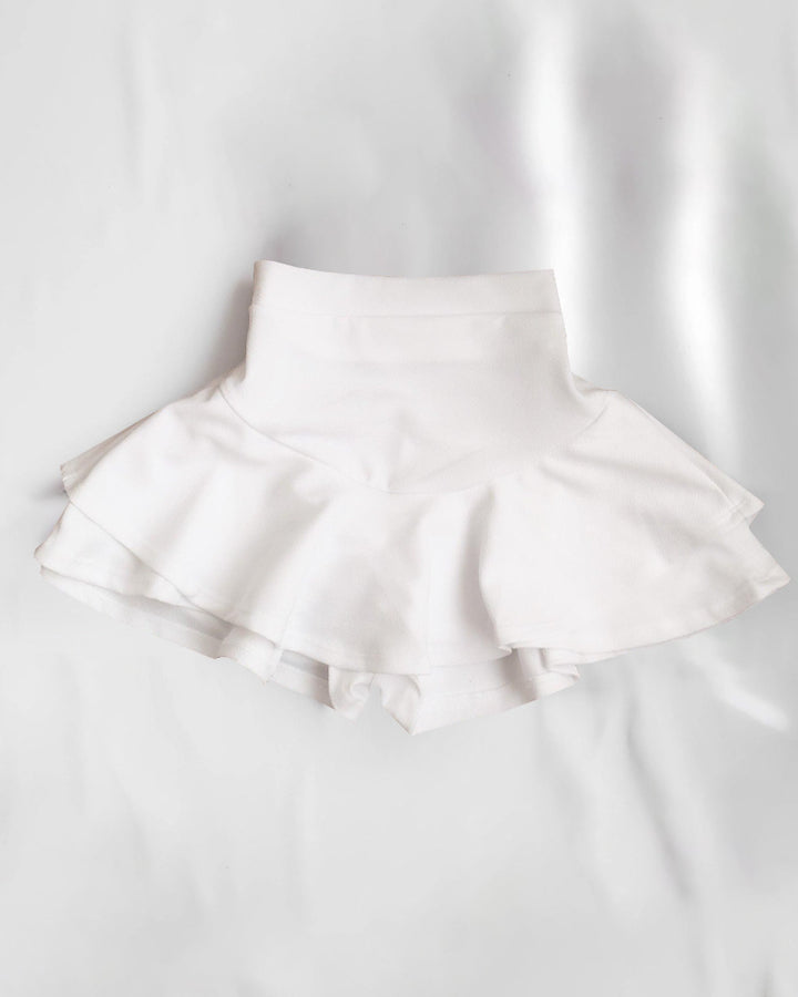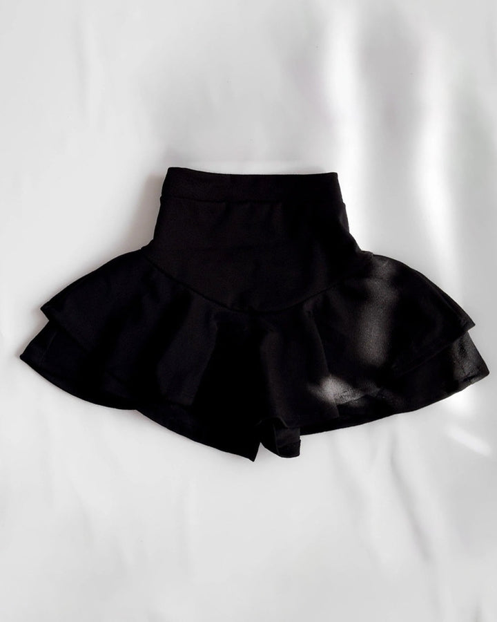 Associez-le au short jupe taille haute à volants pour un look amusant et stylé. Le short jupe combine le meilleur des deux mondes — offrant l'apparence d'une jupe à volants coquette avec la praticité d'un short. Le design taille haute accentue votre silhouette, tandis que les volants ludiques ajoutent une touche de féminité et de mouvement à votre tenue.