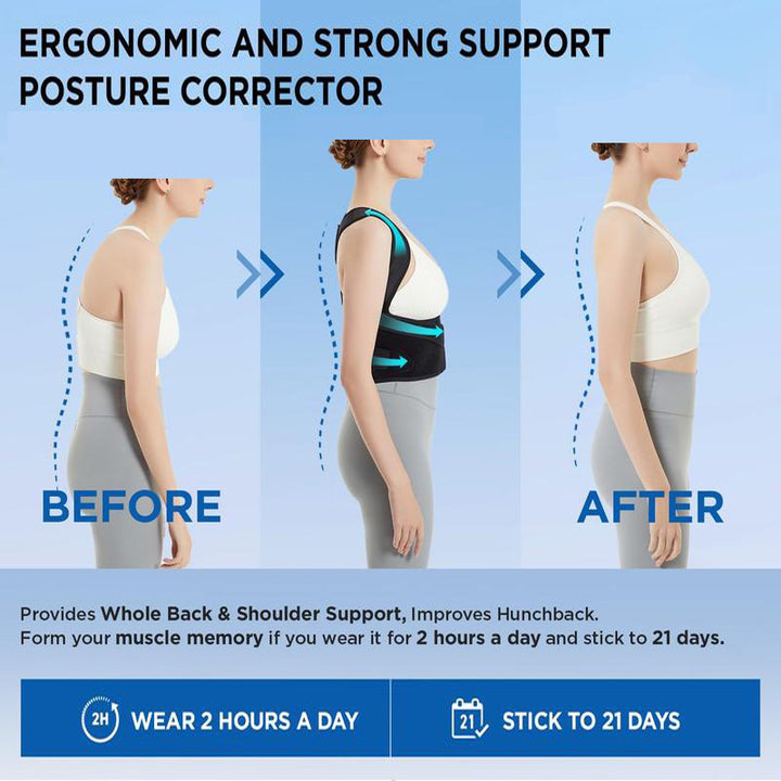 Experience the easiest-to-use posture corrector in the industry! With adjustable straps, this back brace ensures a customized fit for all body types. Simply wear it over your shoulders and secure it around your waist for instant posture improvement.