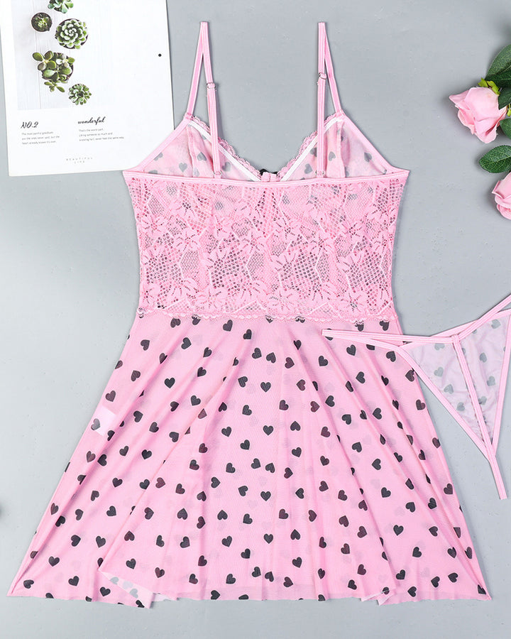 Sexy Lace See-Through Heart Print Camisole Nightdress and Thong Set