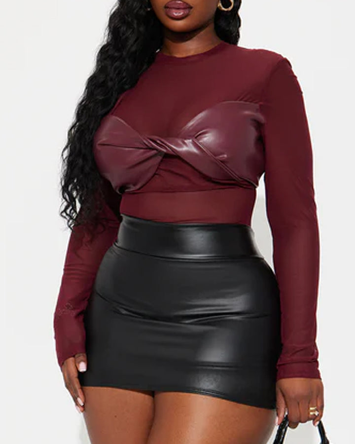 Sexy PU Leather Mesh Long-Sleeved Slim Fit Bodysuit