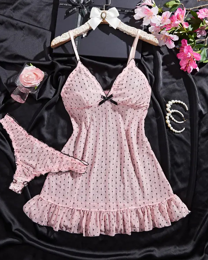 Sexy V-Neck Polka Dot Semi-Transparent Suspender Nightdress Set