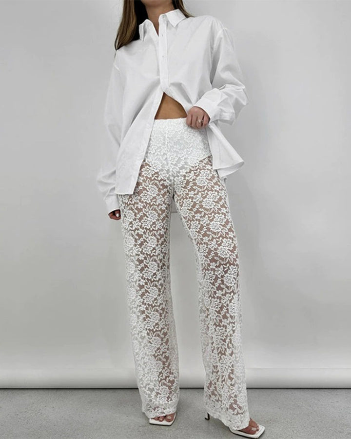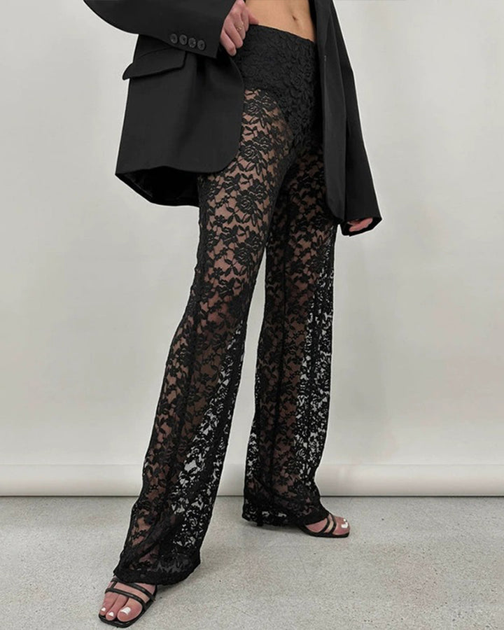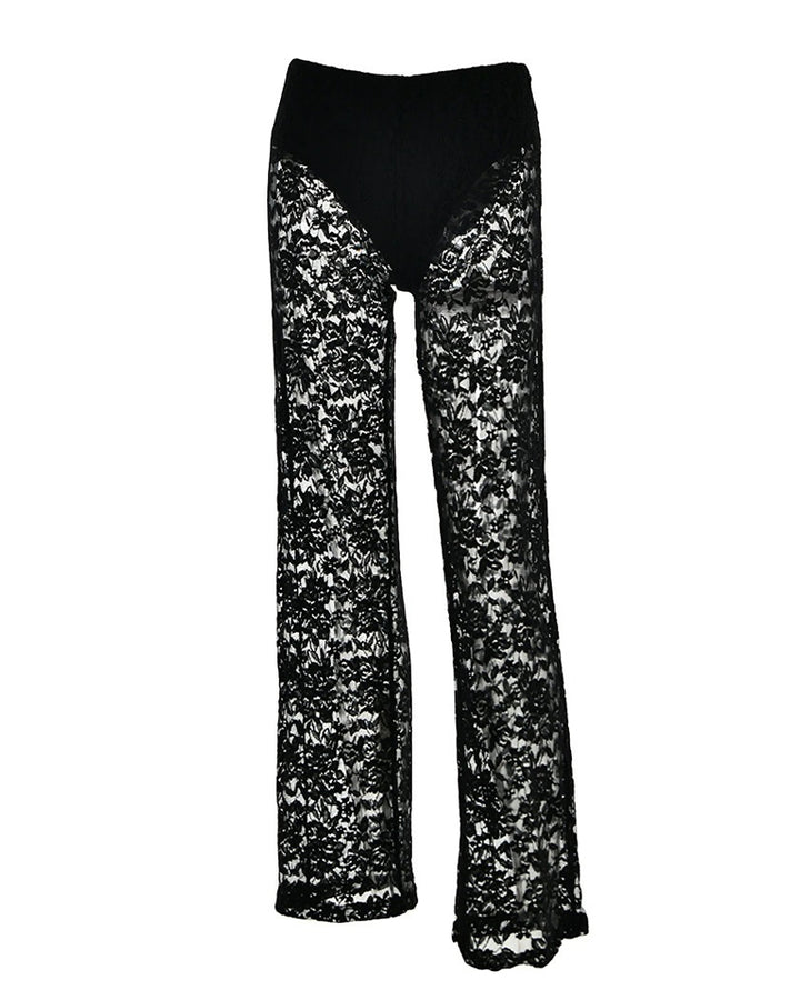 Women's Sexy Lace Mesh Elastic Waist Sheer Stretch Trousers are the perfect blend of bold style and comfort, featuring a sheer lace design, elastic waist, and stretchy fabric for a chic, head-turning look.