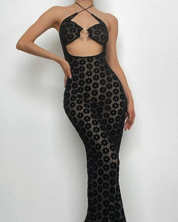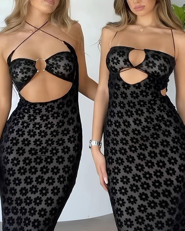 FEATURES: Designed with a sleeveless halter neck, tie-back closure, metal ring accents, and cut-out details, this bodycon dress hugs your figure beautifully. The slim fit and flocked velvet floral pattern enhance your natural silhouette, creating a captivating look.