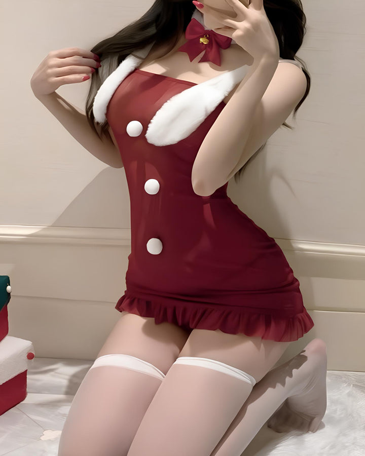 Christmas Sexy Bunny Girl Plush See-Through Mesh Patchwork Strapless Lingerie Nightgown with Headband