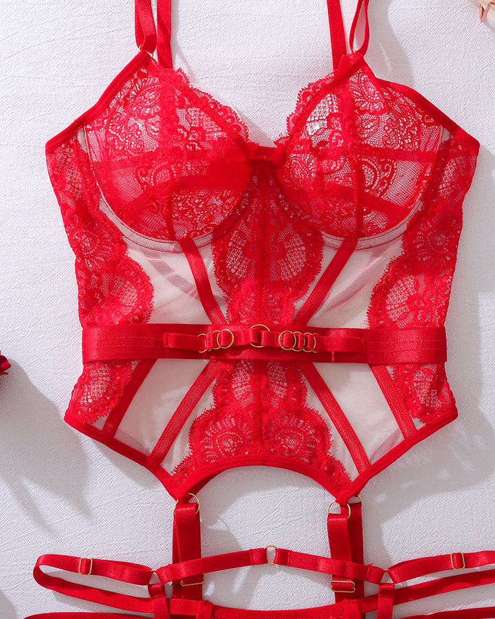 Conjunto de Lingerie Sexy Transparente em Renda Decorado com Fivela de Metal