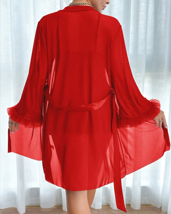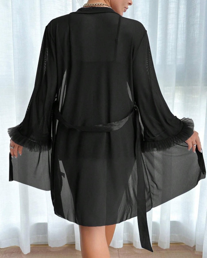 Complete o Conjunto: O robe até ao joelho, feito da mesma renda delicada e rede, prende-se à cintura para uma cobertura ajustável e um toque dramático.