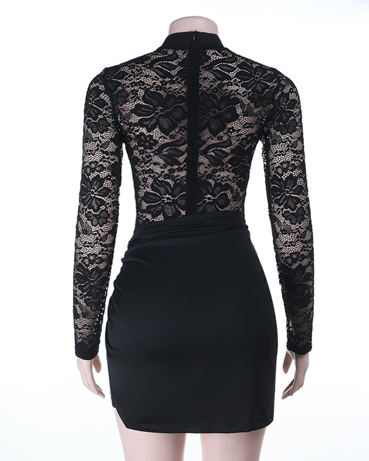 Sexy Lace See-through Round Neck Long-sleeved Bodycon Mini Dress