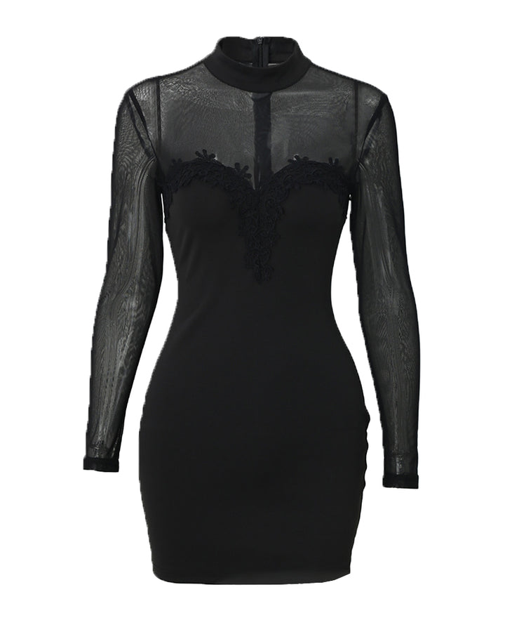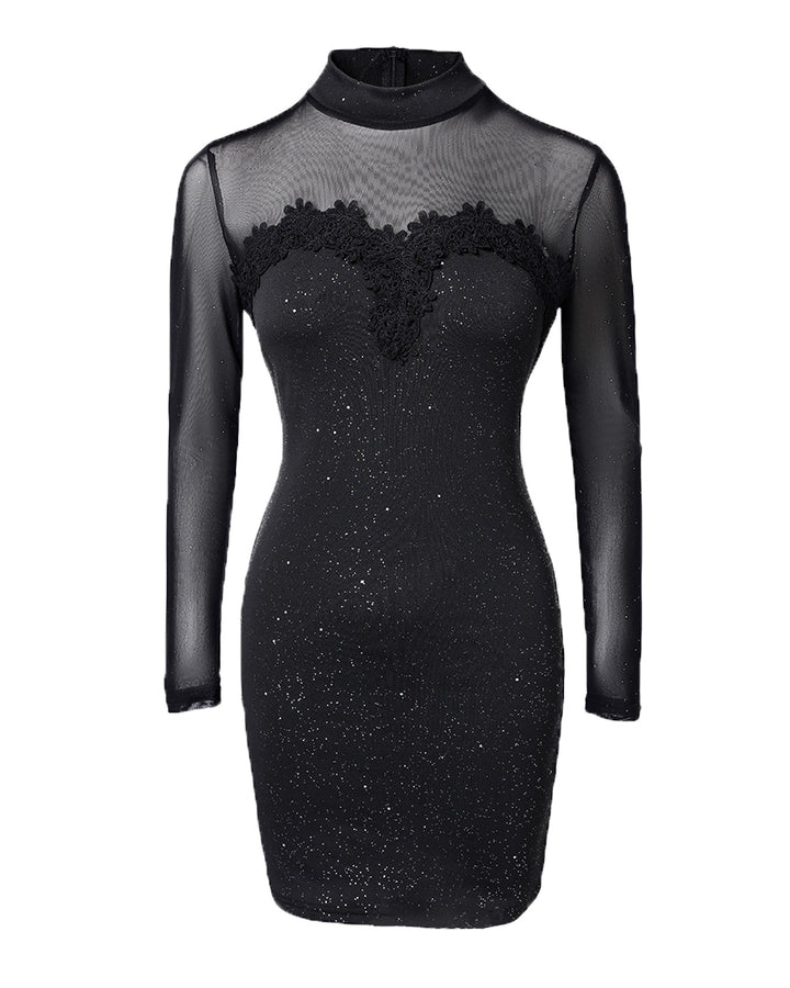 Shimmering Mesh Floral Embroidery Patchwork Round Neck Long Sleeve Bodycon Dress