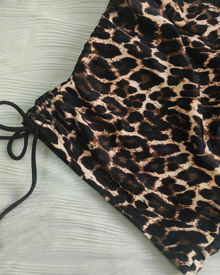 Fato de banho vintage com estampa de leopardo, alças ajustáveis e calções de banho com cordão lateral, conjunto de duas peças
