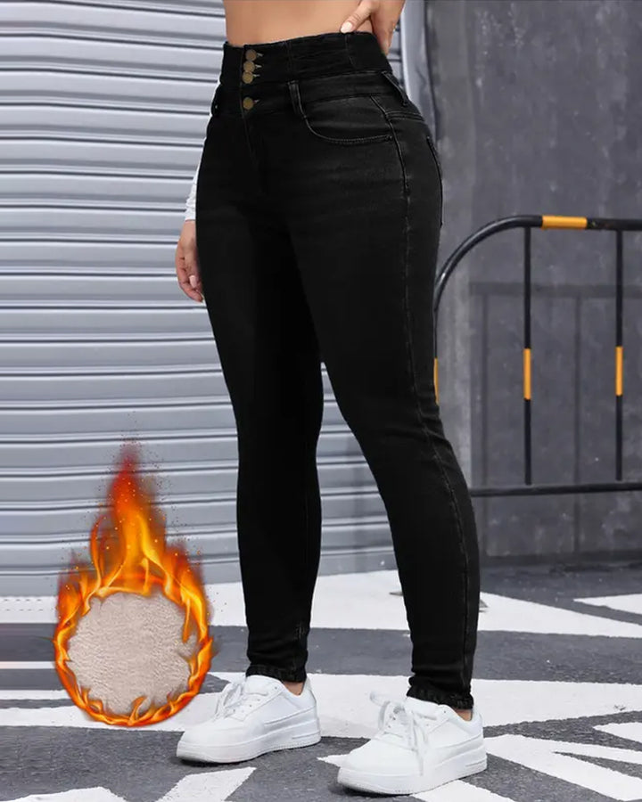 Calças de ganga grossas para mulher, forradas com polar e de alta elasticidade