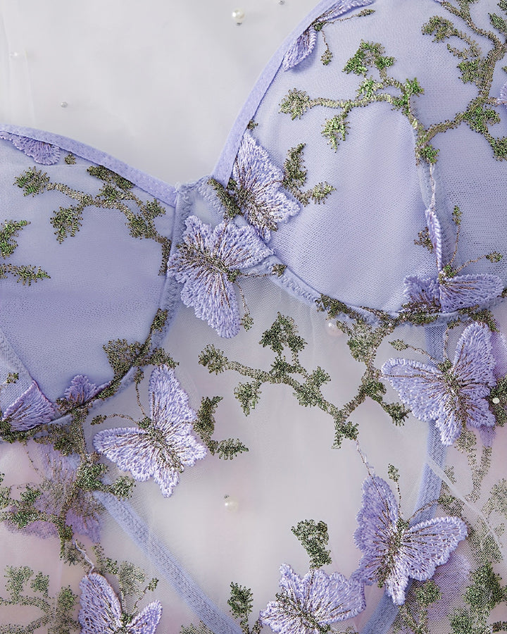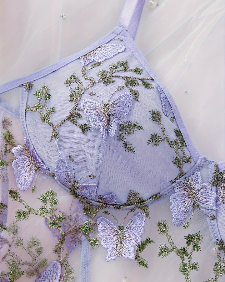 Conjunto de Camisola de Noite com Alças em Tule Bordado com Borboletas Sexy para Mulher e Tanga