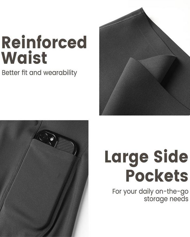 Cintura Elástica com Bolsos Laterais – Sem mais escavar ou enrolar. A cintura larga e de suporte mantém-se no lugar, enquanto os bolsos laterais convenientes guardam essenciais como chaves ou cartões.